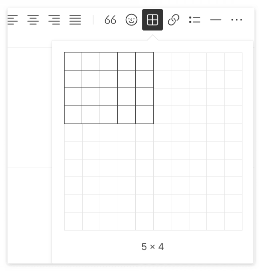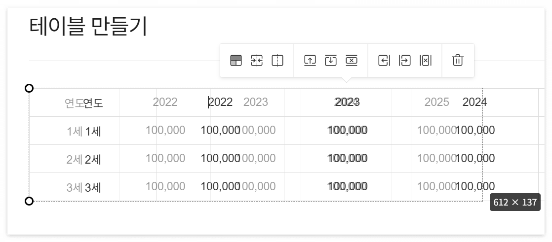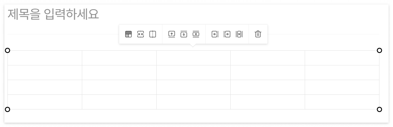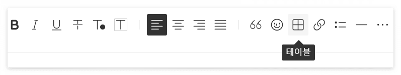 1. 우선 페이지 상단에 "테이블" 아이콘을 누르면 몇줄 몇칸을 선택한다. 테이블을 먼저 생성한다.