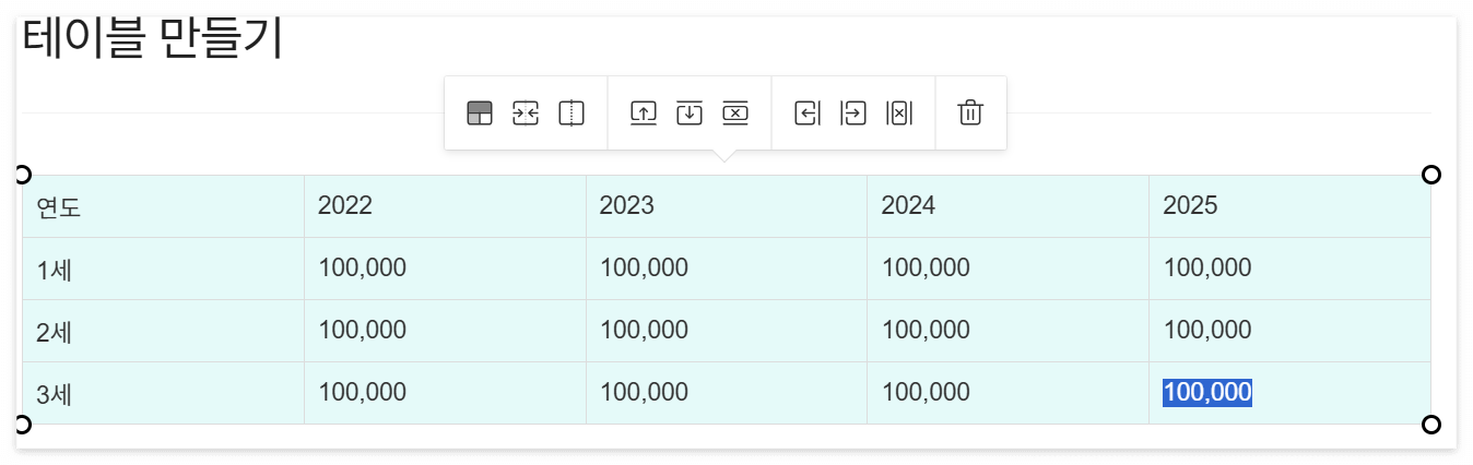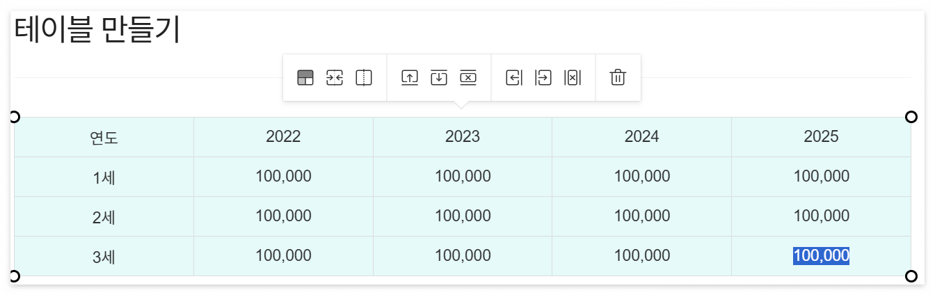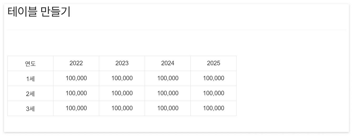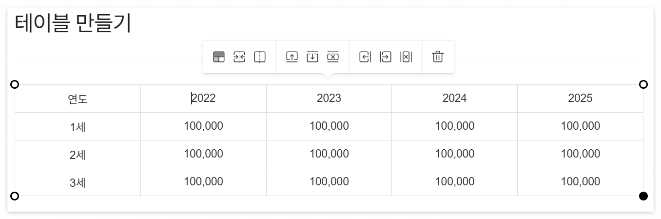 3. 클릭함과 동시에 테이블을 생성해서 아래처럼 표가 만들어 졌습니다.