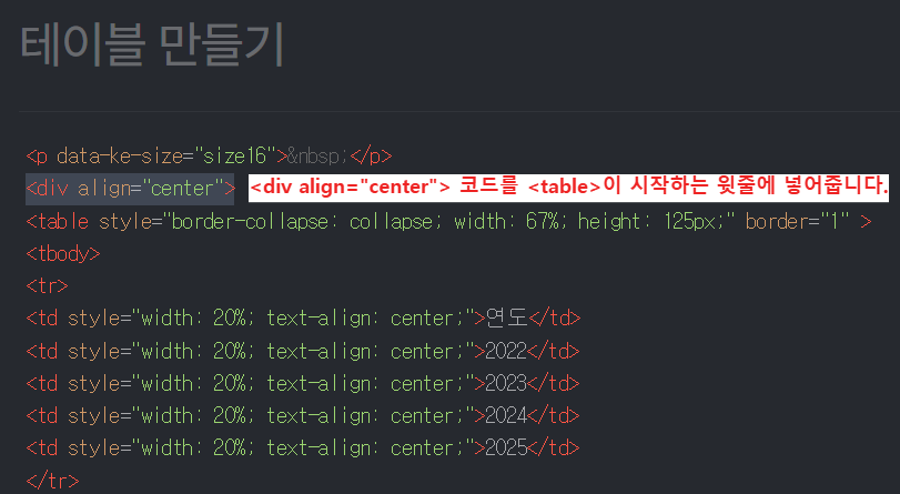 2. 밑의 이미지 처럼 <div align="center"> [테이블 코드] </div>로 감싸줍니다.