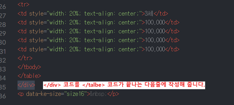 </table> 이 끝나는 줄에 </div> 코드를 넣어줍니다. 이제 다 되었습니다.
